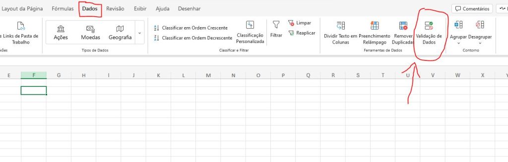 Com a célula selecionada, vá até a aba Dados na barra superior do Excel. Lá, clique no botão Validação de Dados (em algumas versões, pode aparecer como “Data Validation”).