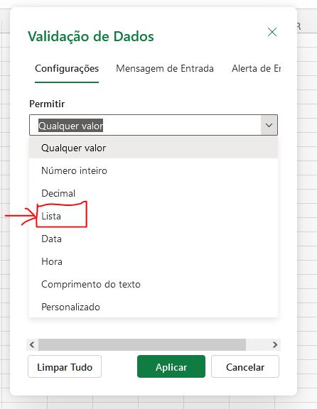 Na janela que se abrir, no campo Permitir, escolha a opção Lista. Isso indica que você quer criar um menu com opções predefinidas.