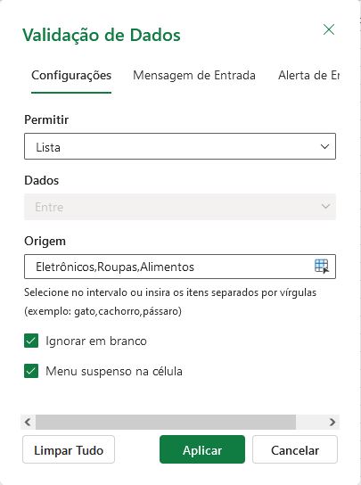 Agora, no campo Fonte / Origem, digite as opções que você quer que apareçam na lista, separando cada uma por vírgula. Por exemplo: Eletrônicos,Roupas,Alimentos